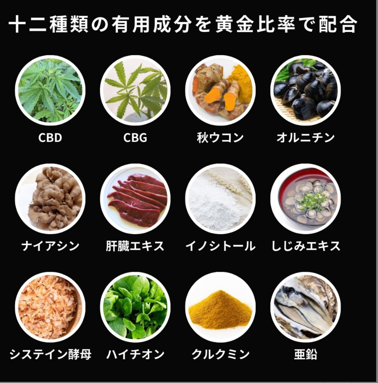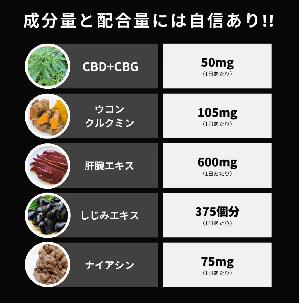 豚肝臓酵素分解物(国内製造)、デキストリン、L- オルニチン塩酸塩、酵母エキス、秋ウコン粉末、しじみエキスパウダー、酵母、カンナビジオール、ウコン抽出物、カンナビゲロール、テルペン/結晶セルロース、ナイアシン、イノシトール、グルコン酸亜鉛、ステアリン酸カルシウム、 酸化ケイ素、HPC、(一部に豚肉・大豆を含む)